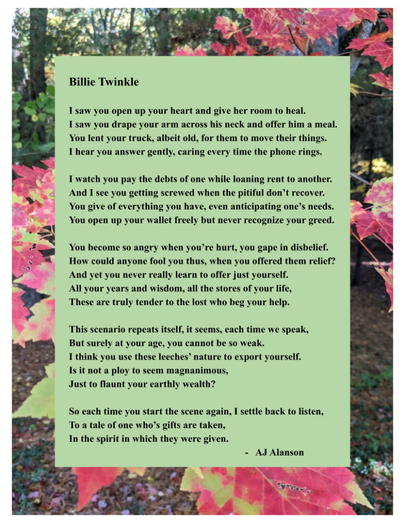 Weekly, I remained a caged bird at my job while one of two topics filled his lamentations: his bad back (hence retirement) and the thanklessness of some new recipient of his largesse. “I loaned him my car. You would think he could show a little respect,” or “I gave her money and this is how I’m treated.”