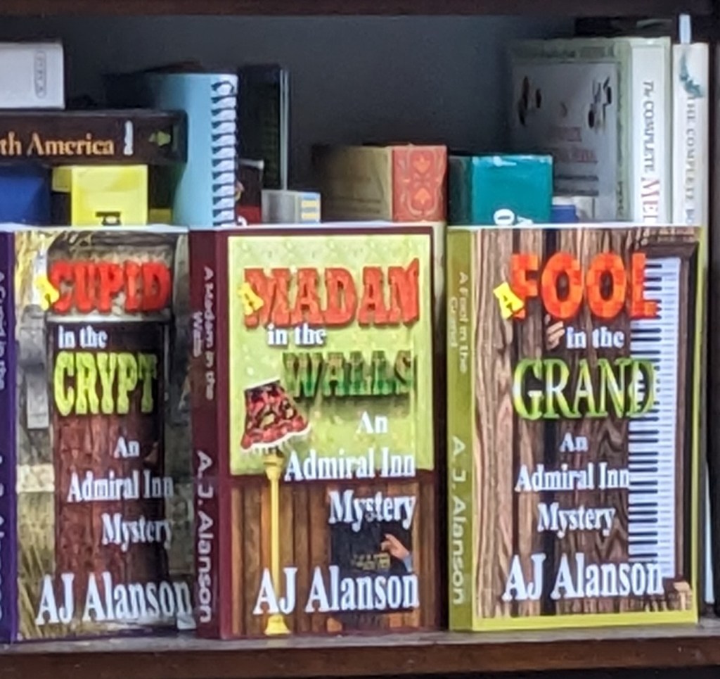 It so happens these three e-books in The Admiral Inn, #4 A Cupid in the Crypt, #5 A Madam in the Walls, and #6 A Fool in the Grand, are all on sale today for 99¢ in the Amazon store today. Catch up for the release of the 9th book, A Witch in the Mill, in early December!