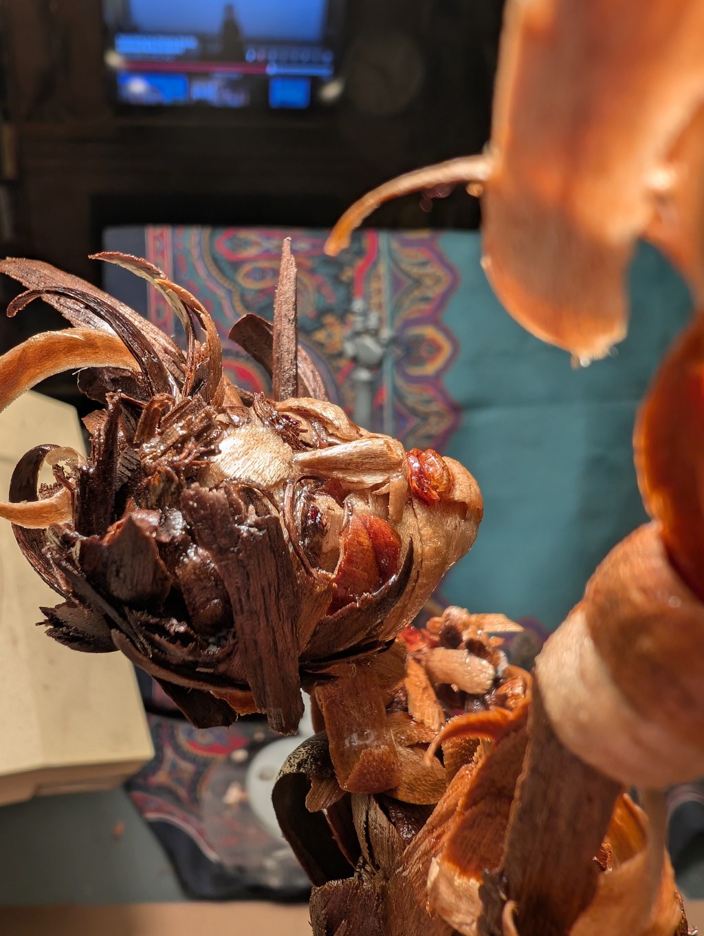 Parts of her are already gone, a shoulder, a leg, and some are disappearing, but still she clamors for any piece she can pull back to herself. Constructed only of a framework of wood curls and chips, the sculpture rose impossibly to nearly 16″. Eager to assemble herself, I only placed the pieces, well, between the miniscule pieces and the glue, I wouldn’t say “placed” as much at I stuck to everything but once in a while, got the chip or curl in the right place.